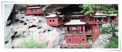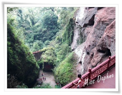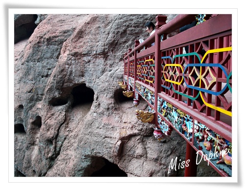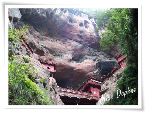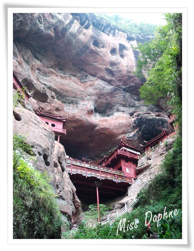 從石獅子處進入,可見壯麗丹霞地質的岩壁裡鑲崁了一座紅色廟宇,