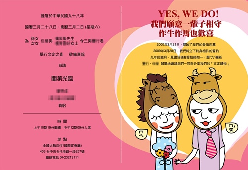 於是,不幫老妹與其男友穿全身乳牛斑馬裝,直接幫他們上頭套並穿正式衣著,喜帖嘛~