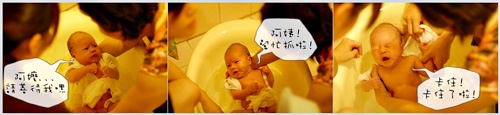 三個人加上旁觀者我擠在小小浴室滿頭大汗地為小阿侖洗澡,