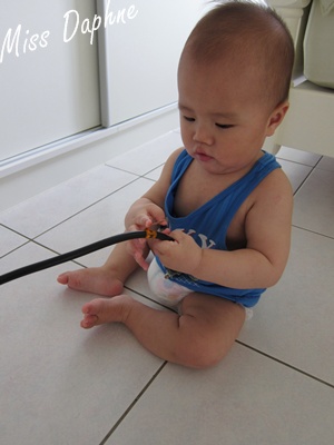 只要早上拖好地,馬上從餐搖椅上抱他下來活動,