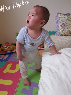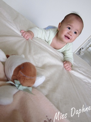 (9m7d) 有時連床都爬上去了,但要有玩具誘因