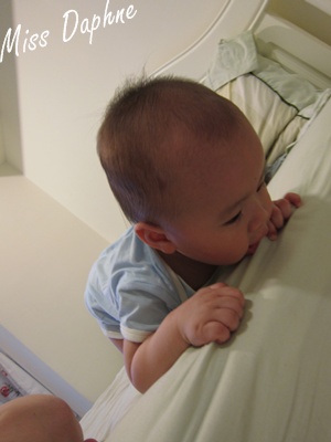 有時候會攀著床沿弓起身子前後搖晃,可能是探媽媽會不會救他?!