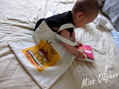 於是,準備好戶口名簿與任一方家長身分證到圖書館,就可領取閱讀禮袋;禮袋內容有兩本圖畫書、《寶寶愛看書》父母導讀手冊與《寶寶第一份書單》推薦書目。可愛的禮袋可以作為日後跟阿侖一起上圖書館借書放書的袋子。