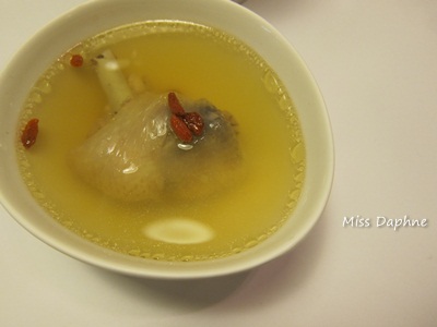 首先,岀場的是暖胃潤喉的清雞湯,可惜我的雞腿帶大骨只能吃少許的嫩肉...