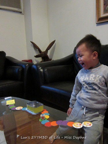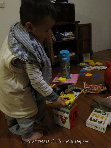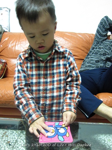 想當初在心裡排表還想幫阿侖上個畫圖課或念唐詩、數數課,但其實根本沒想到阿侖是個活潑好動的小孩,五分鐘有好好地跟妳在那邊畫畫就要偷笑了,又,這階段的他其實也不好伺候,一有不如意的事情就開始鬧情緒、亂丟東西發飆。就拿拼拼圖這件事來說,這個月,他突然開始關注我們很久幫他買的拼圖,雖然只有七片而已,但對於不太會拼圖的他其實是有難度的,所以當他遇到挫折的時候,就開始丟拼圖,然後說"不玩了~";這時候媽媽真的要耐住性子撿起拼圖並慢慢地教他,甚至他開始拼的時候要再旁邊注意他的情緒並且試圖hold住他對拼圖的興趣,遇到他成功拼完的時候全家還要歡聲雷動地拍手鼓勵;於是,過沒幾天,他終於可以自己獨立拼圖,然後還會拿成品過來要掌聲!
