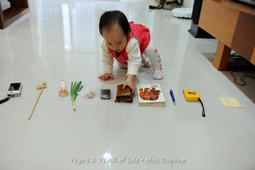總之,我們把祐祐放在起跑線後,就見她慢慢地朝著這些物品跑過來。