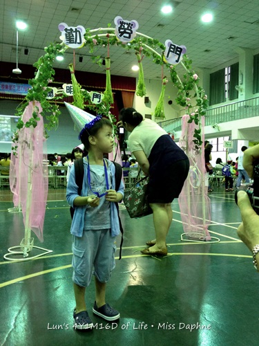 過完聰明門與勤勞門,大家下了樓梯準備前晚各自的學校,這時候小朋友要暫時離開父母或阿公阿嬤了。前面有位小朋友開始啜泣,好像也感染了我跟阿侖,昏暗的樓梯間,吵鬧的人群聲,放都放不開的大小手讓離別的心情越來越沉重;隊伍已經開始前進,被放開手的阿侖卻還待在原地不動一直輕喚著"媽媽~媽媽~"!不知所措的母子倆,還好被迎頭趕上的另一位專屬老師見狀尷尬場面,一手堅定地拉起阿侖的手說著:"老師牽著你的手直到進教室喔!媽媽等一下就會來接你!"