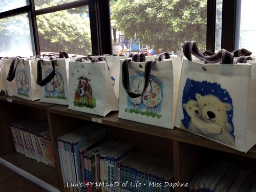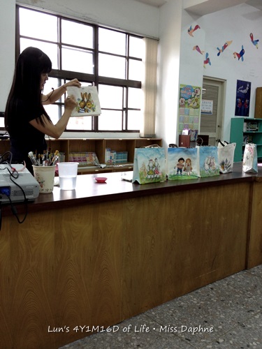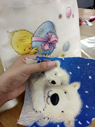 校方在今天贈送小朋友們一個餐袋,這個餐袋必須由父母或阿公阿嬤為小寶貝們製作,在美術老師的帶領下,我們各自選擇了喜愛的圖案餐巾紙,然後刷上轉印膠,用吹風機吹乾便完成的第一部。由於要讓餐袋版面圖案滿版,老師說如果家長沒有辦法畫的話她可以代勞,下個禮拜一就可以拿到成品;若家長有心要親自畫,前面有壓克力彩。當然,大家選擇了專業,不然毀了這個餐袋,不要說自己難帶出場,連阿侖提也尷尬吧!