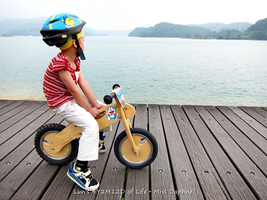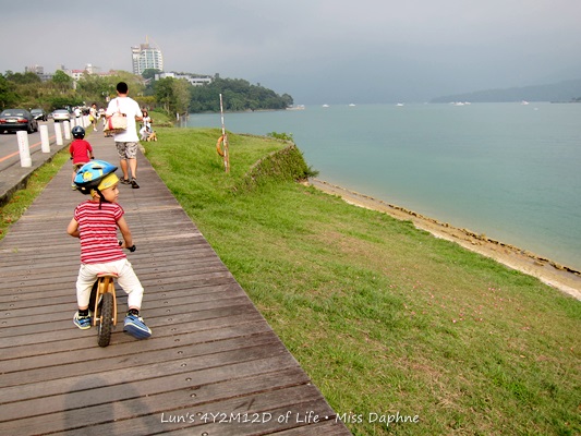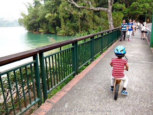 我們的路線是從向山遊客服務中心出發,走在自行車專用歨道,一直到水社壩再折返回到向山遊客中心,總長3.2公里。這不是比賽,所以我們很愜意地走走停停,另一方面也是週末的關係,騎自行車的遊客也多,所以也要小心帶領著小騎士們停下來會車;喜寶的大哥哥們也會在每一個轉折處指揮通往的方向並熱情地幫各位小騎士們加油,一路上,還有幾位熱心的家長拍攝小騎士們的騎上英姿,可見大會用心之處。