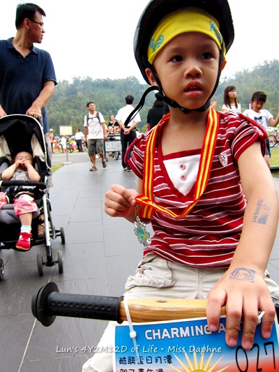 早在三個月前酷騎總部暗示今年的誓師大會將在日月潭舉行後,我不斷地引頸期盼著這一天的來臨。終於9月28日讓我們等到了這一天,每個小朋友300元的參加費用就可以得到酷騎頭巾/刺青貼紙/紅豆餅/養樂多與糖果,一邊貼近日月潭的湖光之美,還可以跟親愛的爸媽騎車健身(當然爸媽在旁邊追趕順便指揮),真的是超優惠!連老公都覺得這金額怎麼可以瓣這麼大場阿?!
