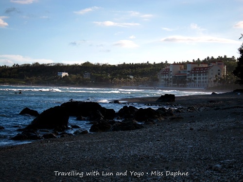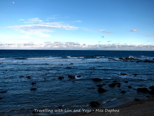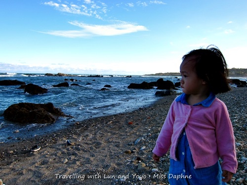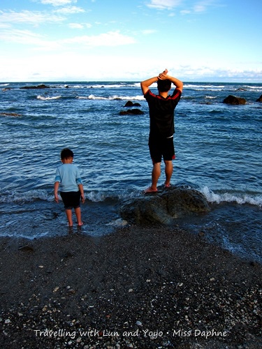 早上海浪也退潮了,露出大大小小的岩石,等待早餐的時候,有一群觀光客來到了海邊,沿著岩石走向海中戲水泡腳。阿侖見到這一幕也叫著要下去玩水,不要開玩笑了,海水冰著呢!我們還是吃完早餐趕緊出發吧!