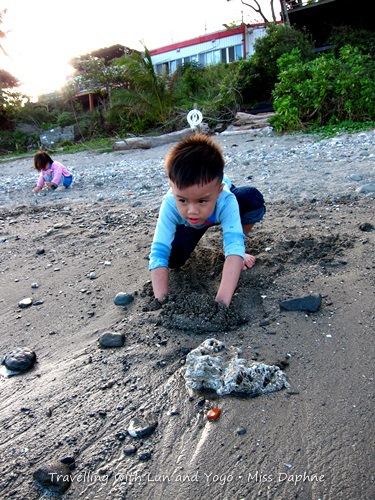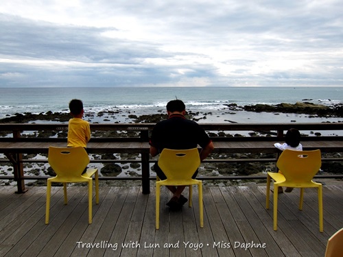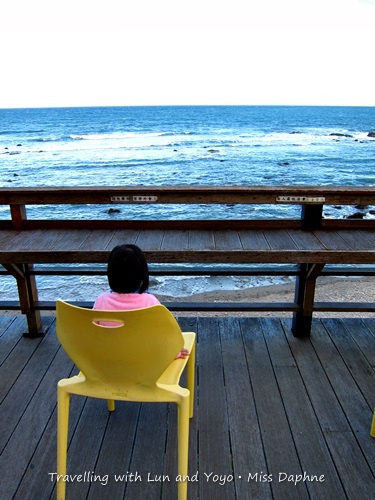 我們在海邊逗留了一個多小時,阿侖玩到兩行鼻涕都流出來了我們才催促著上樓回民宿(這也許是這次感冒前兆!),民宿後院有水龍頭讓我們沖手腳,當我們在沖洗的時候,回過頭來,祐祐自己一人把椅子搬好坐上並默默地望著海邊,是依依不捨嗎?