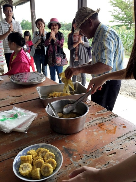 曾先生禮尚往來,先用水煮玉米款待大家!雖然中午吃得撐,但大家把玉米當飯後水果食用;這一吃不得了了!一顆顆飽滿的有機玉米一咬即爆,鮮甜多汁令人一口接一口。於是大家一邊吃著香甜的玉米一邊聽著曾先生述說有機農作的歷程。