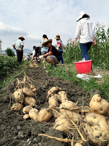 以下小妞是個公主,只怕弄髒她的手跟衣服@@ 就在大人小孩齊力挖番薯下,我們挖出了48台斤的成果,遊覽車滿滿有機玉米與番薯好豐盛阿~對了,還有去阿忠的甲仙統帥芋冰城買的超多伴手禮!