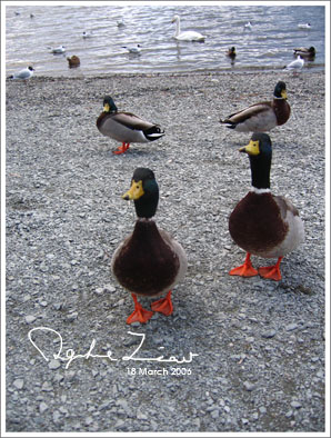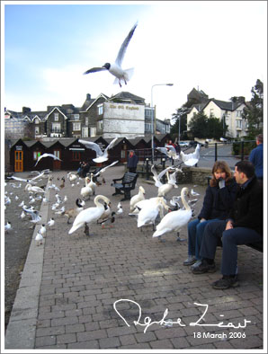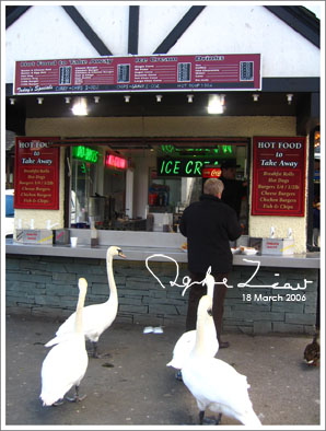 碼頭旁的一家小攤販總是圍繞幾隻貪吃的天鵝,