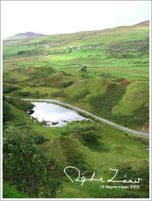 Isle of Skye壯闊的平原丘陵近在眼前,零星小屋點點於廣闊大地中,