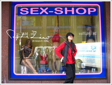 Vicky在情趣店的妖嬌樣;拍照同時,對面二樓有一群人也在叫好!