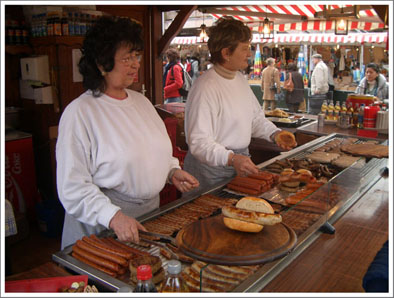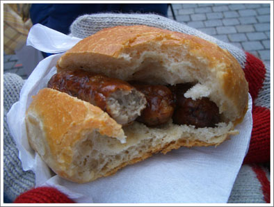 第一攤的小香腸;夾著德國麵包,有芥茉醬或番茄醬調味 (photo by Vicky)